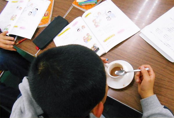 お陰さまで、3月24日(月)で、2014年度レッスンが終わりました。写真のA君はクラスの人気者、久しぶりの紅茶に大喜び!