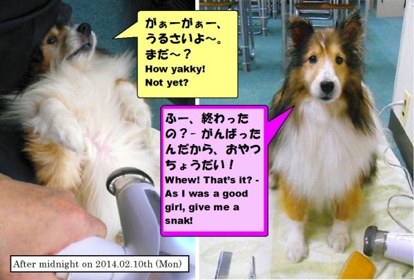 その後、エリーとヨッシーを待ちうけているアクティビティーは、… (a): 耳掃除、(b): タオルでの歯磨き、(c): ドライヤー、(d): ブラッシング、(e): 毛玉取り、(f): 爪切り…最後に、(g): ひっくり返して「皮膚炎になっていないか」の確認:赤い斑点があれば「ドルバロン」の塗り薬を塗り込めます。以上の10項目のケアには、「養父の」私でも2時間かかります。