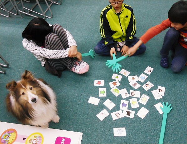 This is one scene of the second lesson of PB-class in 2014. Yoshy was happy to know they were able to enjoy activities by using those picture-cards, reading spellings as well as watching pictures. The cards tell for example, “hungry-full”, “thick-thin”, etc.