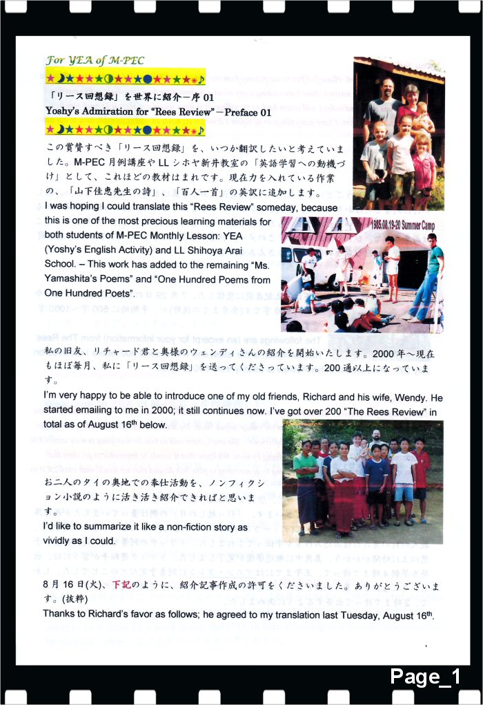 「リース回想録」序-01を冊子にして、タイの奥地で、現地の人たちと、キリスト教の布教活動をしているリース夫妻を紹介しました。英語を学び続ける喜び、動機づけになる良い教材です。リチャード、ありがとう!
