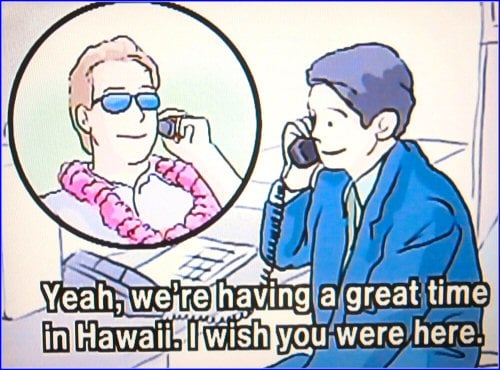 “I wish you were here.” = “As I’m here (in Hawaii), we can’t meet; sorry.”