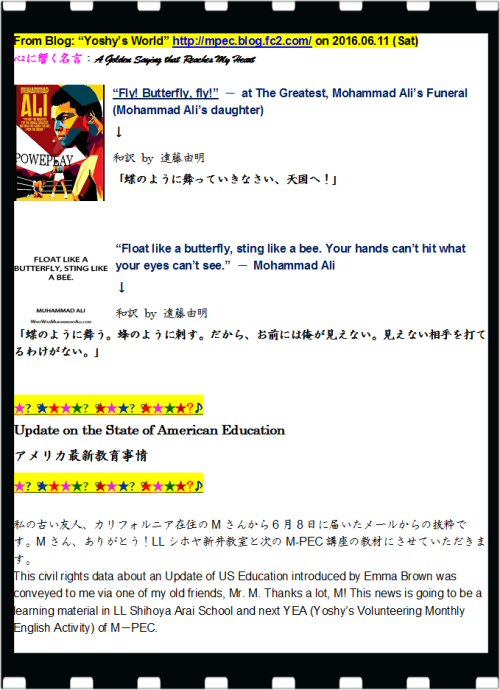 なお、6月12日現在、英語版:ウィキペディア「モハメド・アリ」が従前の紹介より長く、詳細な記述となっています。以下に、一部を引用します。翻訳は、遠藤由明。