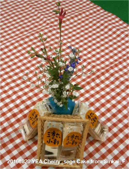 I made a preparation for the 112th YEA (Yoshy’s Volunteering Monthly English Activity) of M-PEC in the afternoon on Saturday August 20th. I placed a single-flower vase with such cute ones Witten above at the preface. Hi, S, thank you for your gift: sponge cakes from Hokkaido!