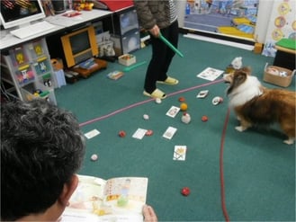 次に、「イースターエッグを転がし」をしました。途中、私の90歳になる義母が作ってくれた「お手玉」に当たると、先に読んだある1場面を二人で、口頭で説明します。例えば、A:「ビフは、馬に乗って遊びました。」に続けて、B:「ぼくは<カウボーイ>だぞ!」のように。1分以内に、バニーにタマゴを届けることができると、二人とも「イースターチョコ」をもらえます。