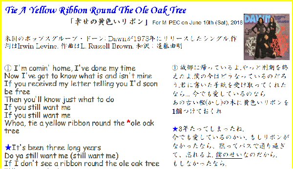 ♪: Let’s sing a heritage popular song! :「幸せの黄色いリボン」, “Tie a Yellow Ribbon Round the Ole Oak Tree”