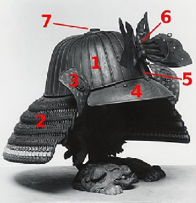 1 hachi / 2 shikoro / 3 fukigaeshi / 4 mae-zashi / 5 hari-date / 6 datemono / 7 hachimanza
