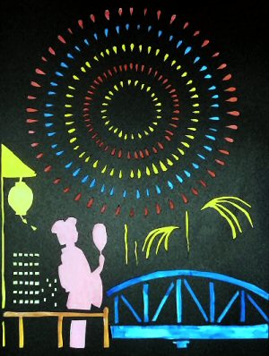 (3) “Making the picture of Firework after learning many shapes in English”:「たくさんの形を英語で覚えて、花火の切り絵を作りましょう!」