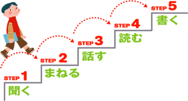 赤ちゃんがお母さんからことばを自然に学んでいくように、「聞く」「まねる」「話す」「読む」「書く」の順で、言語習得過程に沿って進んでいきます。もちろん、この5つは、図のような単純な階段ではありません。相互に絡み合っています。講師は、「今、この子たち、この子は、どのステップにいて、どのステップに導いたらよいのか」をきちんと把握できていなくてはなりません。この教授法を本当に実践できるようになるためには、子供が好きなだけではなく、「高い英語運用力+長年の精進」が求められます。