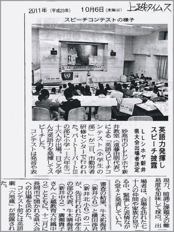 ■10月2日(日)の「#34 LL スピーチコンテスト校内大会・小の部+英語劇:六地蔵」、10月6日(木)の上越タイムスに掲載されました。活字になるって、嬉しいです。支局長のS様に感謝。有線放送のO様にも感謝!今度は、11月20日(日)の「5周年 M-PEC Festival」。有線放送のO様と共に、又ご取材を期待しています。