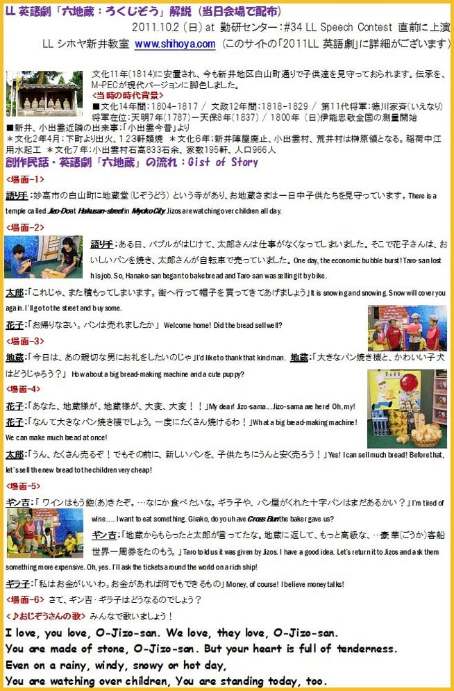 10月2日(日)実施:「#34 Speech Contest 小学生の部」での、「LL英語劇:六地蔵」の概要
