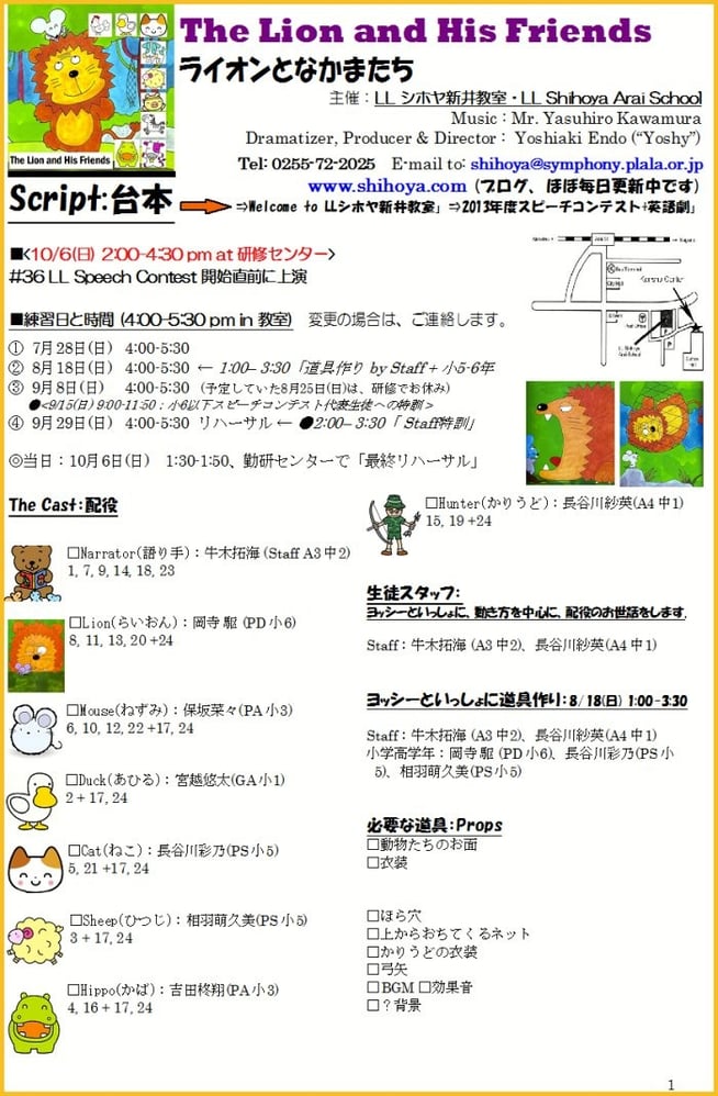9月29日(日)、4:00-5:30 pm、第4回「LL英語劇:ライオンとなかまたち」のリハーサルでした。
