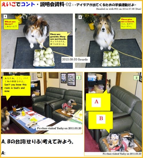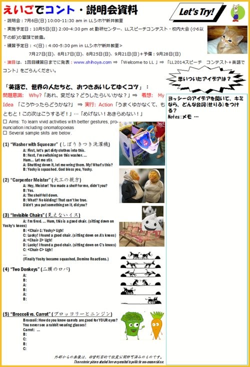 7月6日(日)、10:00-11:30 am、予定通り、「えいごでコント」の説明会を楽しみました。「もしもエリーが先生だったら?」