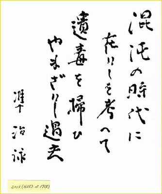 The late Dr. Junji Masui, who has been my family physician since I was a child, loved waka poems very much. Now Let me introduce Tanka-poet, Fumi Saito he liked very much. Let me translate her about fifty poems into English. I will never forget lots of love given from Doc. Masui: ex. warmly inviting me to his residence, his donations to our M-PEC Festivals, encouragement to me, etc. I won’t forget his big and deep virtues; let me share her poems translated by me, which would make him happy in Heaven. He passed away on November 13th, 2014 (H-26).