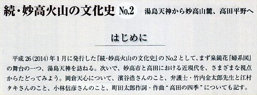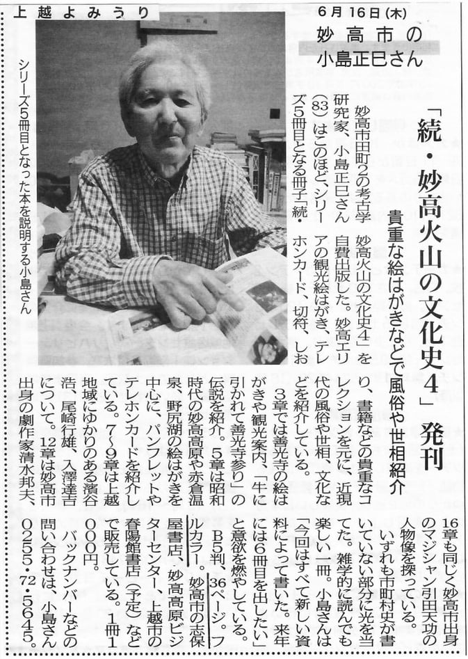 妙高市在住の小島正巳さんが、このたび、新著『続・妙高火山の文化史〈やま〉の考古遺物・人物・観光案内』を自費出版され た。B5判、48ページのオールカラー版である。題名からも 分かるように、本書は、前著『妙高火山の文化史〈やま〉の映像と現地探訪から』の続編である。