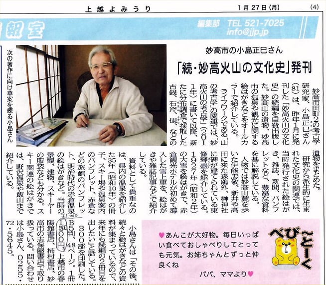 上越よみうり(1月27日(月))の誌面で、CEO、Mr. yasuが「妙高市では(有)志保屋書店で販売中」と書いて下さったお陰で、売り切れました。そこで、小島正巳先生宅へ伺い追加仕入してきました。