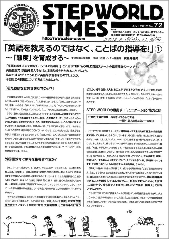 ■いよいよ、ヨッシーの先生、黄金井健夫教授の記事(STEP WORLD TIMES #72:2012年3月19日(月)~LLシホヤ新井教室生徒さん宛てに配布)をLLシホヤ新井教室生徒さん、親御様、M-PEC会員様、このブログの読者諸氏にご紹介いたします。