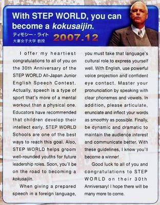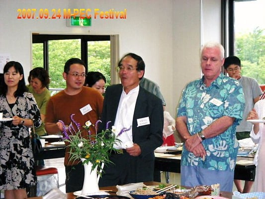 2012年度M-PECフェスティバルへご参加のみなさまお一人お一人に歓迎の意を表します。M-PECは、妙高地域で英語のコミュニケーションと国際理解を促進してもらえることを目的として設立されました。ヨッシーがこのユニークなクラブに私を特別顧問として招いて下さったことは実に名誉なことです。みなさまが、ヨッシーが経営しているLLシホヤ新井教室でご努力を重ねておられることに感動しています。間違いなくヨッシーは私が日本で知己となった最も国際感覚豊かな一人です。LLシホヤ新井教室やヨッシーが提供してくれているこのすばらしい機会をご利用下さい。