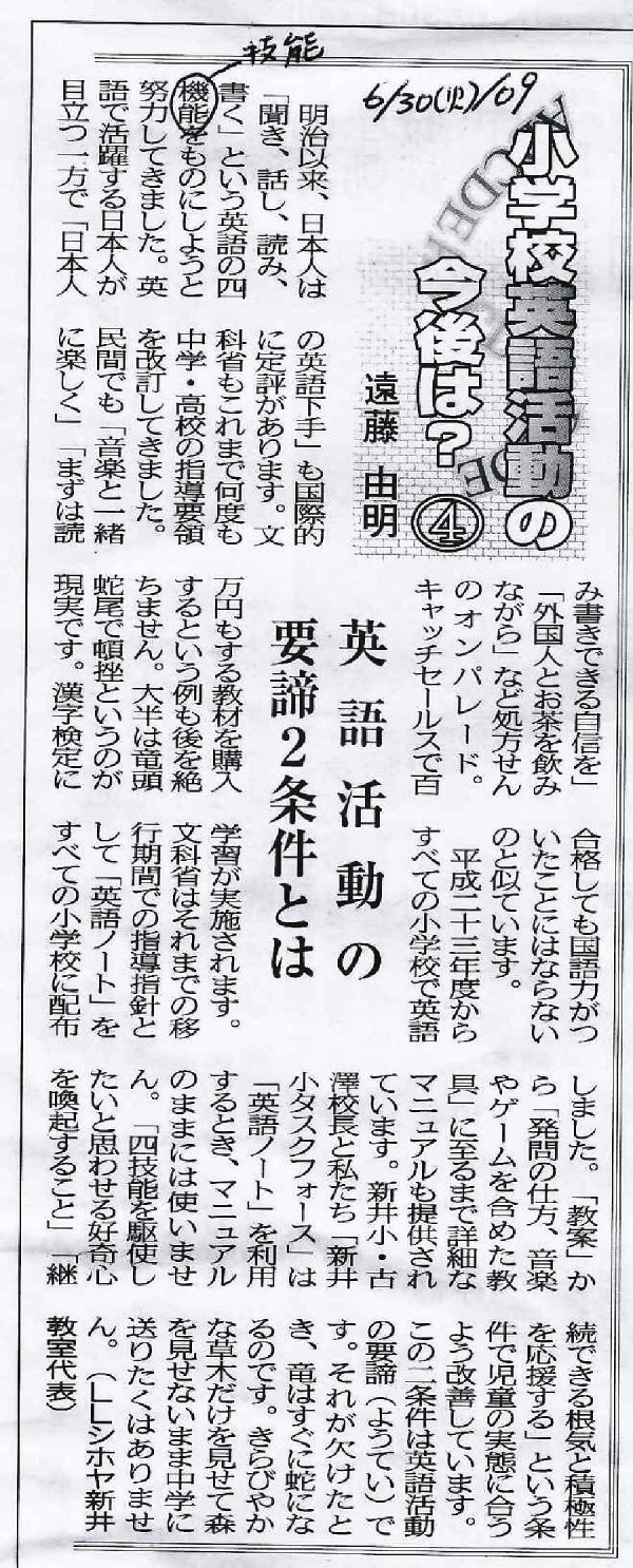 ■新井小・古澤校長と私達「新井小タスクフォース」は、「英語ノート」を利用する時、マニュアルのままには使いません。「4技能を駆使したいと思わせる好奇心を喚起すること」と、「継続できる根気と積極性を応援する」の条件で、児童の実態に合うように改善しています。この二条件は、英語活動の要諦です。それが欠けた時、龍はすぐに蛇になるのです。きらびやかな草木だけを見せて森を見せないまま中学に送りたくはありません。