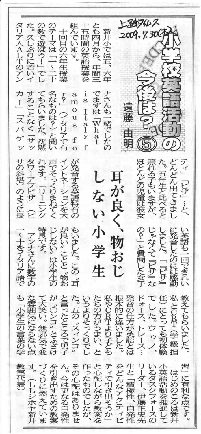 ■新井小では5年、6年生とも、4月から年間35時間の英語授業を組んでいます。私は学級担任(CRT)と、最近は外国人助手(ALT)とも一緒に、子供達と英語での触れ合いを楽しんでいます。