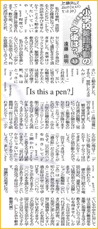 ■論理的思考になっている中学生に対しては、文法構造の難易度を基準に指導する方が教えやすいので、今は止むを得ません。しかし、小5は中1に比べれば、まだまだ理屈抜きの「感覚的学習」、つまり、その子の現実に即した学習内容に感情移入しやすいのです。これを利用しない手はありません。どの国の子供もその言語を文法から学ぶことはないのですから。文科省はいずれ、小中を連動させた指導要領に変更するでしょう。次回は、私が提案する学習内容と教授法の一端をご紹介させて頂きます。