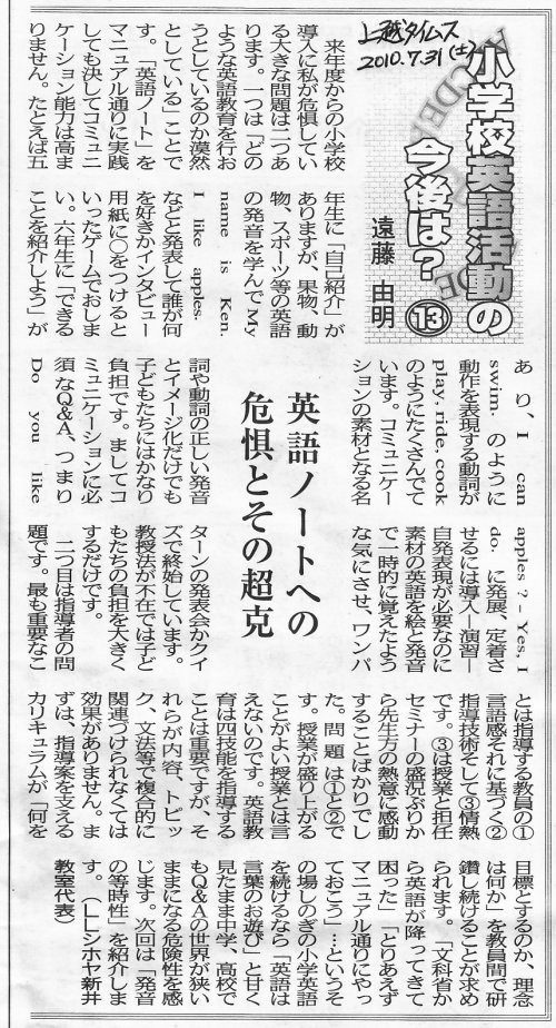 ■「文科省から英語が降ってきて困った」、「マニュアル通りにとりあえずやってゆこう」、「盛り上がる授業にして根気のいる作業はやめておこう」…というその場しのぎの小学英語を続けるなら、「英語学習は言葉のお遊び」と甘く見たまま中学高校でも、Q&Aの世界が狭いままになる危険性を感じます。