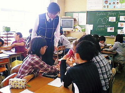 「相撲」、「茶の湯」、御伽噺に出てくる「河童」…など、12枚の絵カードの中から、5,6人の生徒が1組になって5グループが1枚の絵カードを外国人アシスタント教師:ALTに3 wordsで、どの絵を説明しているのか分かってもらえるかを競い合いました。