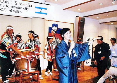 「あらい囃子保存会による、あらい囃子:太鼓演奏」:Japanese Dram performance of Arai Festival by “Arai-Bayashi Preservation Association”は、そのまま直訳で十分通じました。Slovenia高校生達はそのド迫力に、目を丸くしていました。: They were with their eyes wide open! 保存会の皆様も、演奏のし甲斐があったのでしょう。