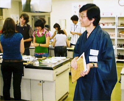 私は着物と雪駄履きの純日本風の服装でお迎えしました。 “Aiueo School staff”が用意したRecipeは「巻き寿司」: vinegared rice rolled with laverと「おにぎり」: rice balls でした。