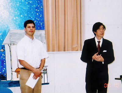 予定では、渡辺雅梗(がきょう)先生の独奏と聞いていましたのに、「春の海」、「桜」を、橋本松央山先生が、尺八で伴奏することになりました。 “Mr. Hashimoto is playing Ms. Watanabe’s koto’s accompaniment on the SHAKU-HACHI”で済まそうと思って紹介し始めましたら、未だ口に咥えておらない状態でしたから、どれがどんな楽器なのか、不思議そうでした。私はすぐに穴の数を数えて、「5つの穴がある、竹でできた垂直に吹くフルート」: “5 holed vertical bamboo flute”と、橋本先生から、よく見えるように掲げてもらいながら説明しました。調べておかなくても、英語は「本質を説明すれば伝わる便利な言語」だと実感しました。