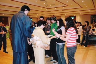 演奏後に「枹(ばち)で太鼓を叩いてOK」の指示が出ました。目は口ほどに物を言い: “The eyes are as eloquent as the mouth.”ですね。 “You can beat the dram on the stage.”と言い終わらないうちに、枹:sticksを握って、構えてたではありませんか。こんな時は通訳不要ですね。興奮さめやらない状態で会食になりましたから、2名にinterviewしました。 “How did you feel?” – 女の子は、「物凄かった! 」: “Amazing!” 男の子は、「失神しそうだった」: “I was *stunned!”