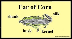 答えは… “corn”(とうもろこし)です。「とうもろこし1本」はan ear of corn と数えます。まだ、皮つきの状態のもののことですね。英語ではとうもろこしは数えられない名詞の仲間です。
