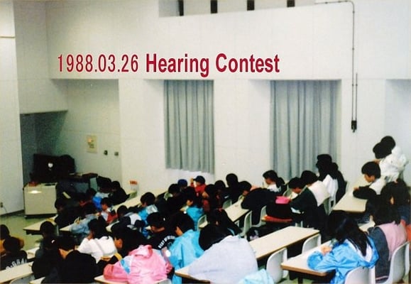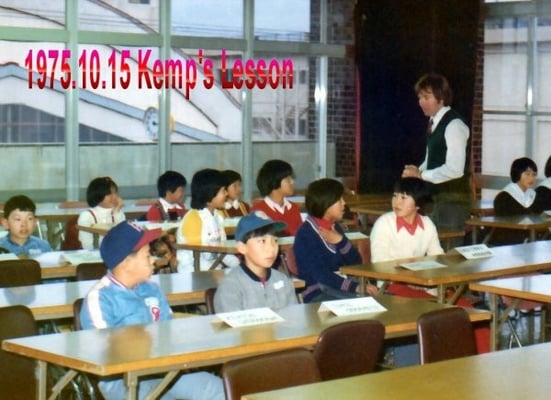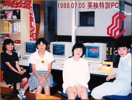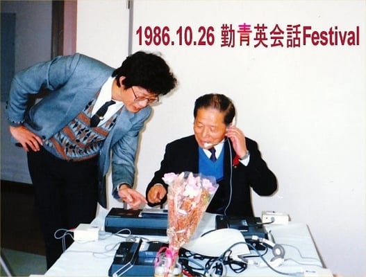 (1-a) 1975年開設当時は、「小学生に英語を教えたら国語学習に弊害が出る」の風潮の中での募集でした。入学して下さった生徒の保護者様は言うまでもなく、戦後の英語教育の礎を築かれた(財)日本LL教育センター創設者の赤尾好夫先生との出逢いのお陰と感謝しています。