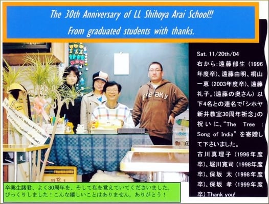 In the beginning years of LL Shihoya Arai School since 1975, I was fighting against such an atmosphere as “Elementary students should not learn English because their command of Japanese is still so rude that their learning Japanese would be confused with it.” I thank not only those parents who let their children enter my school; but also the founder of Foundation Japan LL Education Center, Mr. Yoshio Akao who had built up basis of postwar English education.