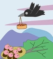 母親は、まだ上手に飛べない子供のカラスに、「さあ、ぴょんとここまで上がるんですよ!」と教えていました。